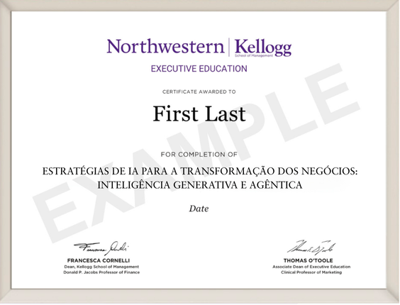 Após concluir o programa com êxito, o seu certificado digital verificado será enviado por e-mail, utilizando o nome que você forneceu no momento da inscrição. Todas as imagens de certificados têm caráter meramente ilustrativo e podem ser alteradas a critério da Kellogg Executive Education.